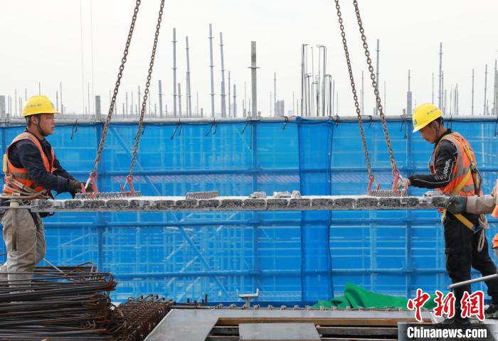 建筑工人在鵲華中和苑建設(shè)現(xiàn)場吊裝疊合板。祁建月 攝